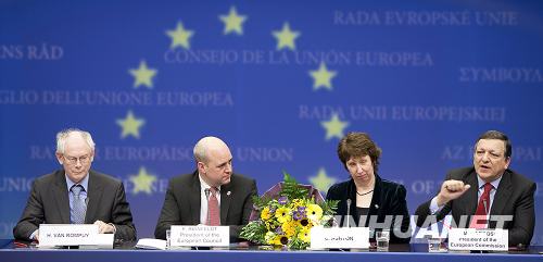 11月19日,在比利時首都布魯塞爾歐盟總部,比利時首相赫爾曼·范龍佩、歐盟輪值主席、瑞典首相賴因費爾特、歐盟貿(mào)易委員凱瑟琳·阿什頓和歐盟委員會主席巴羅佐(左至右)出席新聞發(fā)布會。當(dāng)日,在布魯塞爾召開的歐盟特別峰會上,比利時首相范龍佩當(dāng)選為首位歐洲理事會常任主席,來自英國的歐盟貿(mào)易委員凱瑟琳·阿什頓當(dāng)選為歐盟外交和安全政策高級代表。 新華社發(fā)(莫納斯攝)