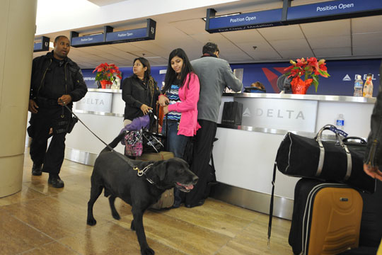 當地時間26日,在美國底特律發生乘客炸機未遂事件后,美國機場以及航空公司加強安全警戒。圖為26日,洛杉磯機場搜爆犬在執行任務。