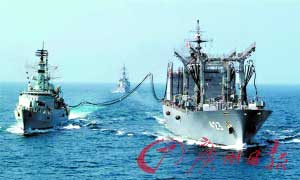 2007年9月,日本海上自衛(wèi)隊(duì)“常磐”號補(bǔ)給艦正在阿拉伯海北部海域?yàn)橐凰野突固跪?qū)逐艦加油。 (資料圖片)