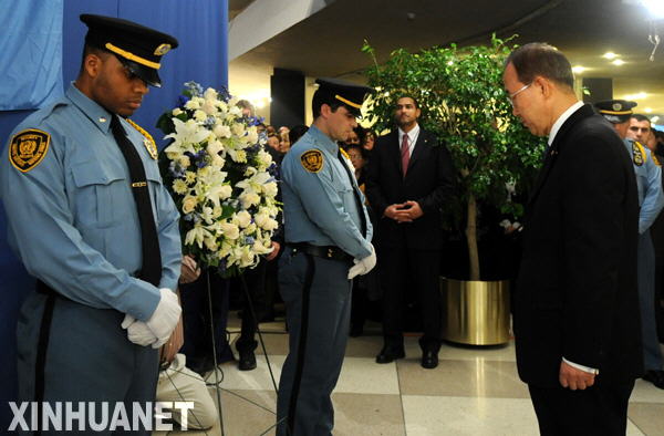 1月19日,聯合國秘書長潘基文(右)在紐約聯合國總部為海地地震遇難者舉行的悼念活動上默哀。當日,聯合國總部舉行花圈敬獻儀式和燭光悼念活動,向在海地地震中遇難的聯合國工作人員及所有的地震遇難者表示哀悼。新華社記者申宏攝