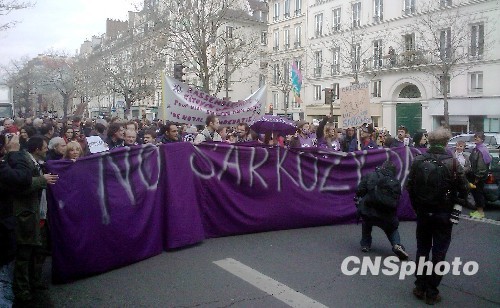 數千法國網民27日在巴黎共和國廣場附近舉行主題為“無薩科齊日”的游行示威活動,表達對法國總統薩科齊的教育改革及養老金制度改革等政策的不滿,并要求其辭職。 中新社發 石航 攝