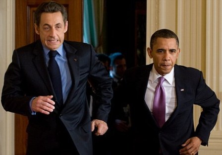 法國總統薩科齊和美國總統奧巴馬跑進白宮新聞發布會現場