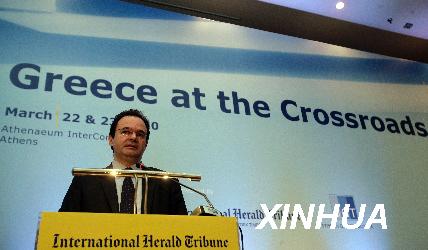 2010年3月23日,希臘財政部長喬治·帕帕康斯坦季努在雅典舉行的“希臘在十字路口上”經濟研討會上發言。新華社發 馬里奧斯·羅洛斯攝 資料圖片