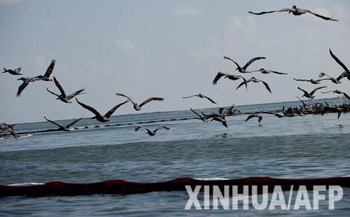6月10日,在美國(guó)路易斯安那州的格蘭德艾爾,鵜鶘在墨西哥灣海面的隔油帶上飛翔。美國(guó)專(zhuān)家10日公布的初步調(diào)查結(jié)果顯示,在6月3日英國(guó)石油公司實(shí)施“切管蓋帽”工程之前,估計(jì)每天有2萬(wàn)至4萬(wàn)桶原油泄漏到墨西哥灣,大大高于此前的估計(jì)。新華社/法新