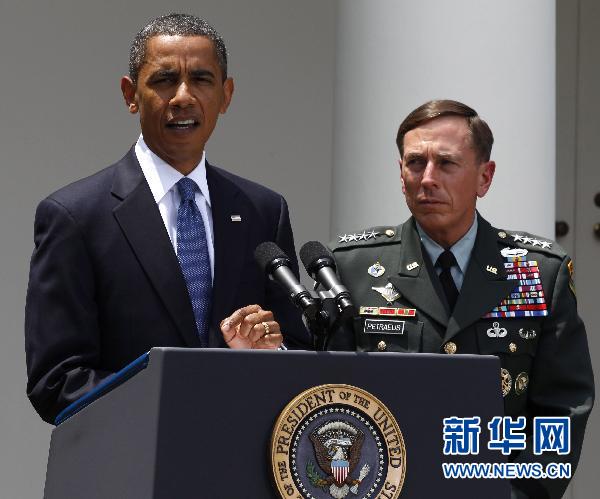 6月23日,美國(guó)總統(tǒng)奧巴馬在華盛頓白宮宣布戴維·彼得雷烏斯(右)為駐阿富汗美軍司令。奧巴馬當(dāng)天宣布,接受駐阿富汗美軍司令斯坦利·麥克里斯特爾提出的辭呈,由美軍中央司令部司令戴維·彼得雷烏斯接替其職務(wù)。 新華社/路透