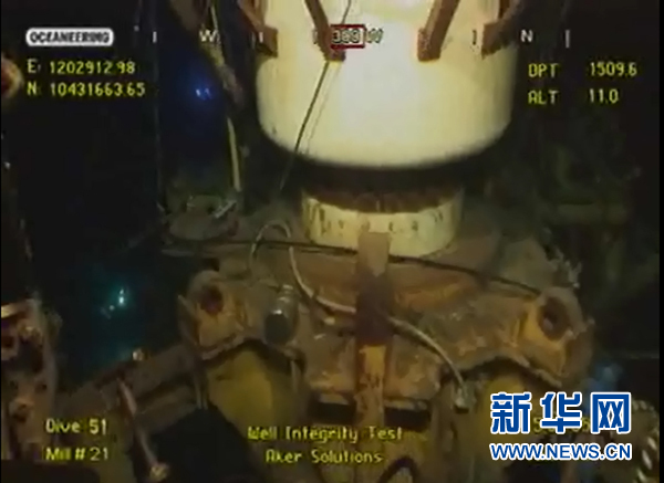 7月15日,監控墨西哥灣海底漏油油井的攝像頭拍攝的視頻截圖顯示,漏油油井裝上新的控油裝置后再無原油漏出的跡象。在墨西哥灣漏油事件發生近3個月后,英國石油公司15日宣布,新的控油裝置已成功罩住水下漏油點,“再無原油流入墨西哥灣”。新華社發