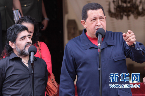 7月22日,在委內瑞拉首都加拉加斯總統府,委內瑞拉總統查韋斯(右)與阿根廷國家足球隊主教練馬拉多納會面。查韋斯22日宣布與哥倫比亞斷絕外交關系,以抗議哥倫比亞日前關于多名哥反政府武裝頭目藏身委內瑞拉的指責。查韋斯當天上午在總統府會見馬拉多納時說:“出于尊嚴,我們別無選擇,只能斷絕與哥倫比亞的外交關系。”新華社發