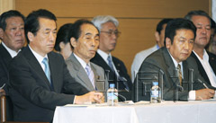 日本民主黨29日在東京憲政紀(jì)念館召開(kāi)兩院議員大會(huì)總結(jié)參院選舉慘敗的原因。首相兼黨代表菅直人(左一)等人表情嚴(yán)峻。