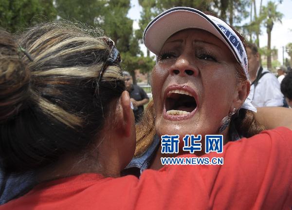 7月28日,在美國亞利桑那州州府菲尼克斯的首都博物館前,兩名婦女在得知法官的禁令后相擁而泣。當日,美國聯邦地區法院法官在菲尼克斯宣布禁令,阻止亞利桑那州新移民法SB1070法案中最受爭議的四項條款生效。 新華社記者戚恒攝