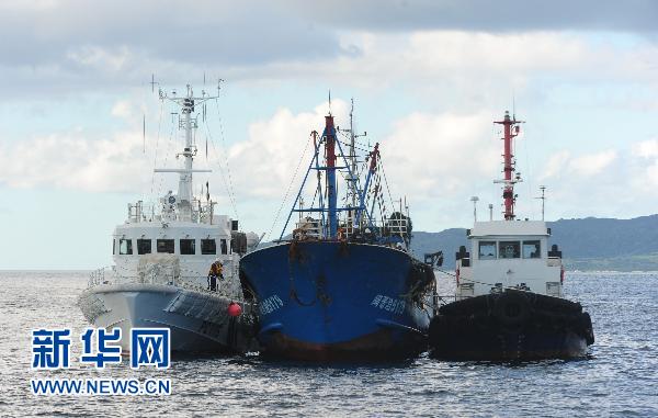 資料圖片:9月12日,日本海上保安廳的兩艘巡邏船將中國(guó)漁船夾在中間。當(dāng)天,日本海上保安廳將中國(guó)漁船拖到?jīng)_繩縣石垣港附近海域進(jìn)行了模擬海上作業(yè)檢查。 新華社記者季春鵬攝