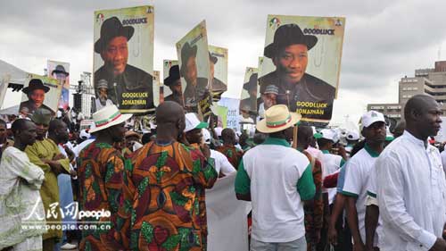 尼總統(tǒng)喬納森的支持者在阿布賈雄鷹廣場參加競選集會。殷淼攝