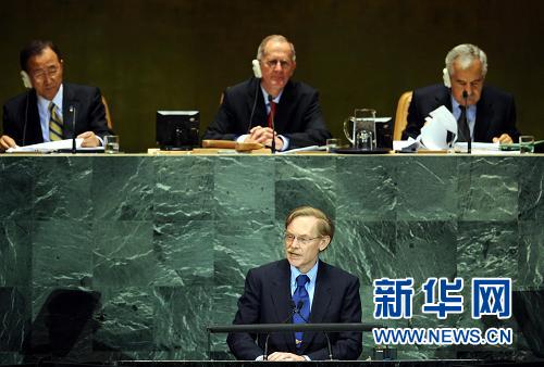 9月20日,世界銀行行長佐利克(下)在聯合國千年發展目標高級別會議上發言。當日,聯合國千年發展目標高級別會議在紐約聯合國總部開幕。此次會議為期3天。與會各國領導人和國際組織的負責人將在全體會上發表講話,就千年發展目標執行現狀以及如何加快實現目標闡明觀點。大會還將召開多場圓桌會議,分別討論貧困、性別平等、健康和教育、可持續發展和加強伙伴關系等問題。新華社記者申宏攝