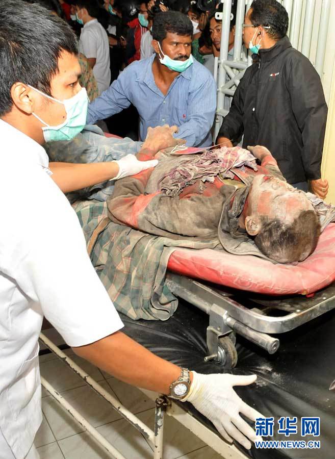 10月26日,印度尼西亞默拉皮火山附近的一名因火山噴發(fā)受傷的男子被運(yùn)往醫(yī)院。位于印度尼西亞中爪哇省的默拉皮火山26日下午開始噴發(fā)火山灰,已致死十余人。新華社/法新