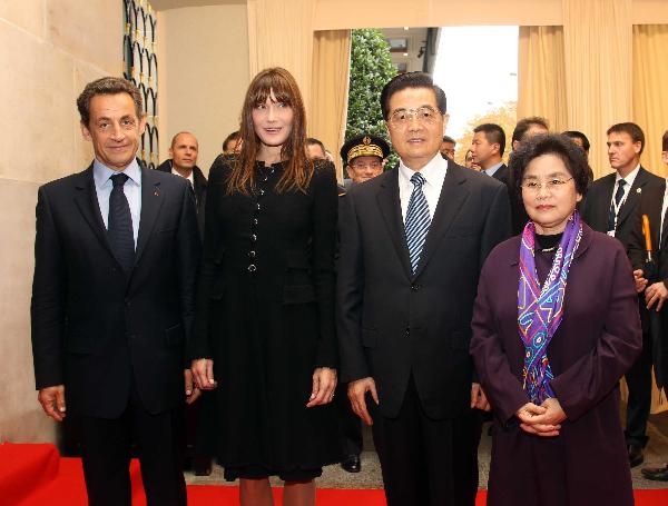 2010年11月4日 胡錦濤抵達巴黎對法國進行國事訪問 11月4日,中國國家主席胡錦濤乘專機抵達巴黎,開始對法國進行國事訪問。這是胡錦濤主席和夫人劉永清在法國總統薩科齊和夫人布魯尼的陪同下抵達下榻飯店。新華社記者 蘭紅光 攝