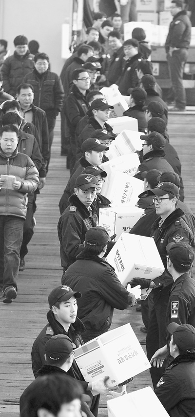 11月24日,在韓國仁川港,人們往軍方艦船上搬運生活物資準備運送到延坪島。新華社發