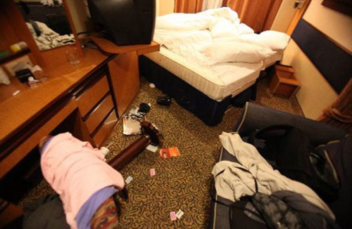 時速60公里的狂風夾帶著暴雨致使這個9萬噸重的巨輪船身搖晃傾斜,船上家具和乘客幾次被甩到空中。雨水猛擊船窗,原本平靜的旅行變成了一場惡夢。