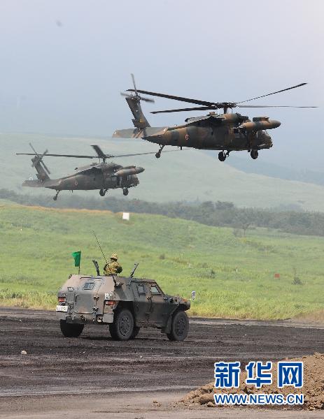 這張8月24日拍攝的照片顯示,武裝直升機和裝甲車輛在富士山腳下參加日本陸上自衛隊2010年富士綜合火力演習。 記者 季春鵬 攝
