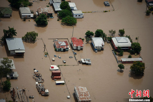 位于澳大利亞東北部的昆士蘭州近日連降暴雨,暴雨引發50年來最大的洪澇災害,造成重大財產損失。當地20萬人受到洪水的影響,4000多人被迫轉移搬遷。目前昆州一些地區的降雨仍在繼續。圖為1月6日,昆州首府布里斯班的暴雨造成多街區被淹,水位猛漲。