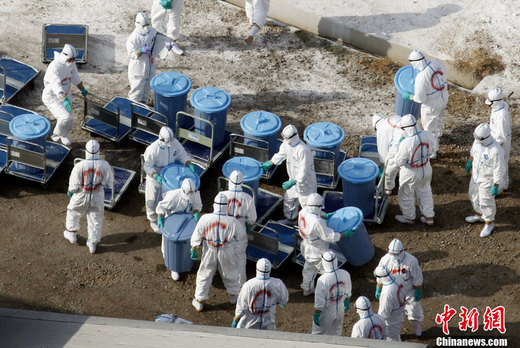 1月24日,在日本宮崎縣的一家出現高致病性禽流感疫情的養雞場,身著防護服的工人正在轉移被屠宰的雞。宮崎縣政府23日宣布,已確認該縣新富町一家養雞場出現高致病性禽流感疫情,這是短短數天內宮崎縣第二次報告禽流感疫情。