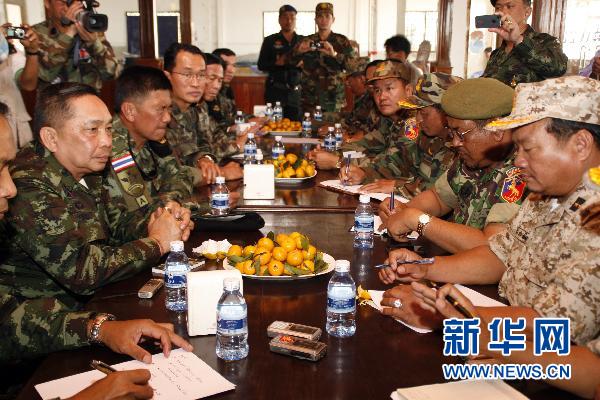 2月5日,柬泰兩國高級指揮官在柬埔寨奧多棉吉省安隆汶邊境口岸柬方一側舉行會談。會談后雙方表示已就避免再次發生武裝沖突達成一致。柬埔寨王家軍第四軍區司令謝蒙(右一)和泰國皇家軍泰國第二軍軍長塔瓦猜(左一)參加了當天的會談。經過90分鐘的會談,雙方達成了3項共識:停止在兩國邊境容易引起爭議的地方修筑道路;推動兩國聯合邊界委員會盡快進行勘界工作;雙方不再調動軍隊并不再發生武裝沖突。新華社發(索萬納拉攝)