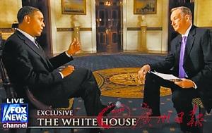 在美國橄欖球大聯盟“超級碗”賽前報道中,美國?怂剐侣勁_現場直播主持人比爾·奧賴利對奧巴馬的專訪。