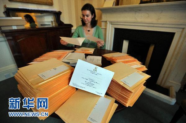 2月16日,一名工作人員在英國白金漢宮整理邀請函。英國王室官員19日說,英國女王伊麗莎白二世已向國內外大約1900人發出邀請函,請他們出席威廉王子與未婚妻凱特·米德爾頓定于今年4月舉行的婚禮。據報道,受邀者既包括王室成員、國家元首、足球明星等“重量級”人物,也包括普通民眾,如“準新人”朋友、慈善人士甚至無家可歸者。新華社/法新