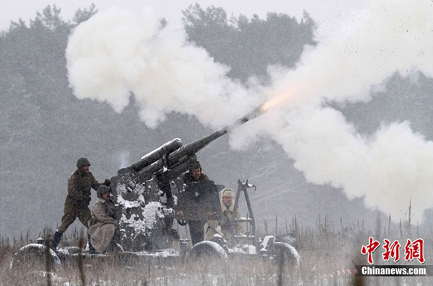 2月20日,在烏克蘭基輔郊外,數百名士兵身穿二戰時期軍服,再現二戰時期蘇聯紅軍與德軍激戰情景。