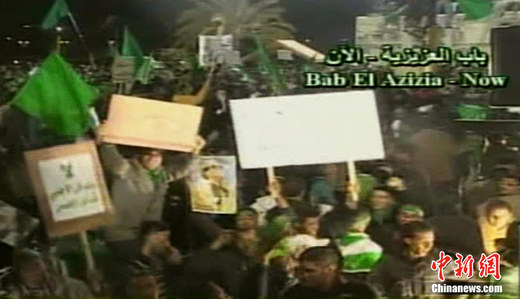 當?shù)貢r間3月22日晚,多國部隊對利比亞發(fā)動19日以來的第4輪空襲。22日深夜,利比亞領(lǐng)導(dǎo)人卡扎菲站在他被導(dǎo)彈襲擊官邸的陽臺上向大批支持者發(fā)表演,指責(zé)西方國家對利比亞發(fā)動的軍事行動是“十字軍國家對伊斯蘭國家發(fā)動的新十字軍東征”,并且表示他和他的支持者將在對反叛武裝和多國部隊的戰(zhàn)斗中奮戰(zhàn)到底,取得最后的勝利。圖為利比亞國家電視臺的截圖。