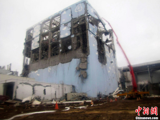 由東京電力公司3月22日拍攝,并于當天公布的圖片顯示,工作人員正嘗試向福島第一核電站4號反應堆進行噴水作業。