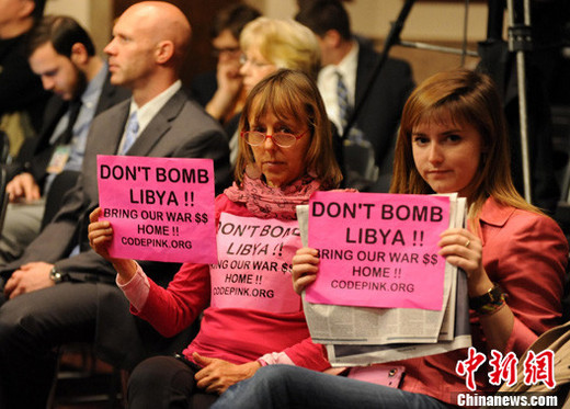 圖為美國(guó)著名反戰(zhàn)組織“粉紅密碼”兩名成員當(dāng)日在參議院軍事委員會(huì)的聽證會(huì)上舉著反對(duì)轟炸利比亞的標(biāo)語(yǔ)進(jìn)行抗議。中新社發(fā) 吳慶才 攝