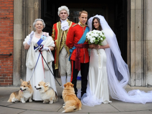 據(jù)報道,當(dāng)天一架華麗的馬車載著身著盛裝的“英國女王”、“威廉王子”和他的“準(zhǔn)王妃凱特”,現(xiàn)身倫敦市中心的皮卡迪利廣場(Piccadilly Circus ),立刻引起了周圍群眾的關(guān)注。只見在“皇家隨從”的護衛(wèi)下,神似“本尊”的三人在街頭行走,并在教堂前擺出姿勢,供圍觀者拍照留念。“英國女王”還牽著三只小狗,就像真正的女王一樣。