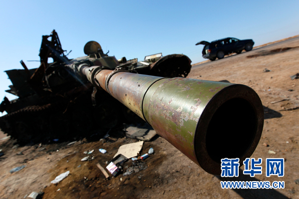 4月5日,在利比亞布雷加前線附近,一輛被摧毀的政府軍坦克。利比亞領導人卡扎菲的部隊與反政府武裝5日在利比亞東部小鎮布雷加交火,失去北約戰機空中掩護的反政府武裝不敵卡扎菲部隊,被迫后撤。新華社記者才揚攝