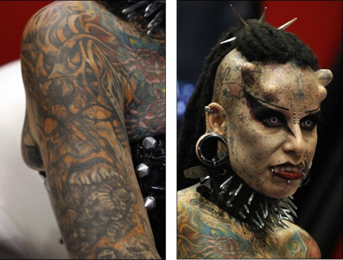 不久前,克里斯特納在加利福尼亞州蒙特雷舉辦的紋身展覽上,展示了自己的造型。“‘角’是力量的象征,植入它們的時候我沒打麻藥,”她表示,“牙齒的造型是因為我從小就喜歡吸血鬼,我還刻意改變了眼睛的顏色,以求更像他們。”