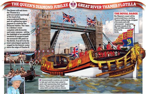當天,英國女王會乘坐一艘特別設計的游艇,率領一個由1000艘形態各異的船只組成的龐大船隊,行駛在泰晤士河上。