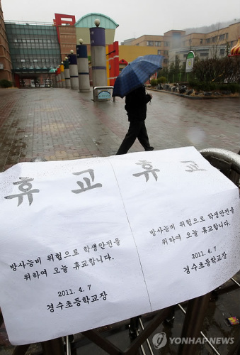 韓國7日大部分地區(qū)降雨,雨水含有微量放射性物質(zhì),部分學(xué)校決定停課。圖為學(xué)校在校門貼出了停課通知。