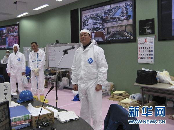 這張日本經濟產業省4月9日提供的照片顯示,日本經濟產業大臣海江田萬里(右)當天在福島第一核電站視察時向東京電力公司員工發表講話。新華社/路透