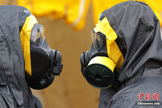 4月9日,日本東京,美國(guó)海軍陸戰(zhàn)隊(duì)的化學(xué)生物事件快速反應(yīng)部隊(duì)在橫田空軍基地進(jìn)行除污演練。