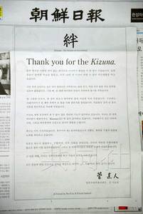 感謝信刊登在《人民日報》使用了半個版面;在《朝鮮日報》內頁,約占三分之一篇幅。感謝信以英文“Thank you for the Kizuna”為題,用中文和韓語記錄了菅直人的話語。