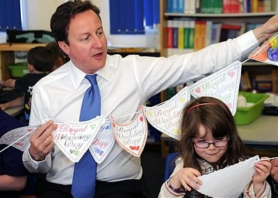 卡梅倫在英國曼徹斯特一所學校幫孩子們制作慶祝威廉大婚的彩旗