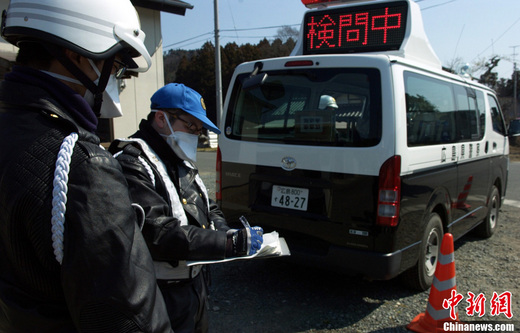 3月30日,記者駕車準(zhǔn)備前往距離福島第一核電站30公里的南相馬市。剛一進入南相馬市境內(nèi),就被3名全副武裝的警察攔了下來。這3名警察來自廣島,他們奉命在此提醒每一位路過的車輛,由此進入30公里半徑范圍,有核輻射的可能。據(jù)警察介紹,在30公里半徑范圍有數(shù)個這樣的關(guān)卡,而在20公里半徑,這樣的關(guān)卡更加密集。圖為執(zhí)行警示任務(wù)的廣島警察。中新社發(fā) 孫冉 攝
