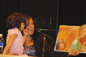 總統(tǒng)奧巴馬的妹妹、華人之妻瑪雅懷抱兩歲的女兒薩薇塔·吳為讀者朗讀她創(chuàng)作的兒童讀物《通往月亮之梯》。(美國《僑報》/邱晨 攝)
