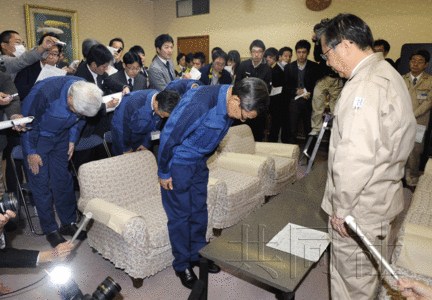 東京電力社長清水正孝(中)一行22日上午在福島縣政府辦公樓同該縣知事佐藤雄平會面并道歉。(共同社)