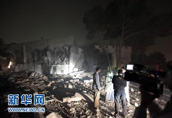 4月25日,在利比亞首都的黎波里,人們站在被轟炸的利比亞領(lǐng)導(dǎo)人卡扎菲的官邸旁。(圖片來(lái)源:新華網(wǎng))