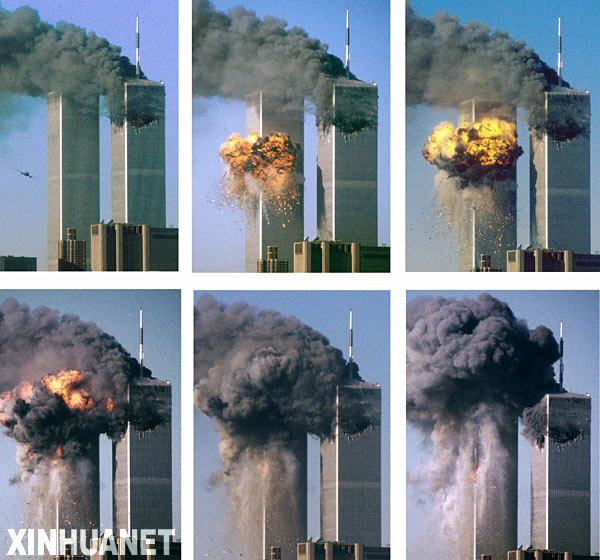 2001年9月11日,恐怖分子劫持了美國(guó)4架民航客機(jī),其中兩架撞坍了紐約世貿(mào)中心“雙子大廈”,一架撞毀華盛頓五角大樓的一角,另一架墜毀。這一系列襲擊導(dǎo)致3000多人死亡,并造成數(shù)千億美元的直接和間接經(jīng)濟(jì)損失。這是一架飛機(jī)撞擊紐約世貿(mào)中心“雙子大廈”南樓的拼版照片(2001年9月11日攝)。新華社發(fā)
