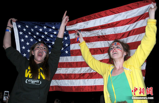 美國總統奧巴馬1日晚突然召開記者會,正式宣布基地組織頭目本·拉登已經死亡。在奧巴馬發表演講前后,許多美國民眾已高舉國旗聚集到白宮附近,他們高呼口號,慶祝拉登之死。 中新社記者 德永健 攝
