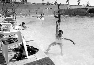 8月25日,一名反對派士兵在卡扎菲兒女豪宅的泳池中舉起步槍
