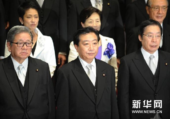 9月2日,在日本東京,日本首相野田佳彥(前排中)率內閣成員集體亮相。新華社發(關賢一郎攝)
