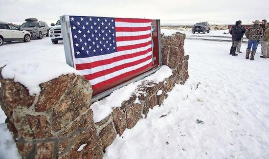 資料圖:民兵組織占領(lǐng)馬盧爾國家野生生物保護區(qū)總部,并在入口處蓋上美國國旗。(路透社)