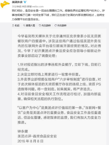 美團(tuán)點(diǎn)評一首席食品安全官鐘永健通過微博指出,今早看到有關(guān)媒體關(guān)于北京通州區(qū)北京像素小區(qū)無資質(zhì)餐飲商戶的報道中,涉及這些商戶通過包括美團(tuán)外賣在內(nèi)的互聯(lián)網(wǎng)外賣平臺吸引顧客開展經(jīng)營的情況。對此情況,今早7時許美團(tuán)點(diǎn)評食品安全應(yīng)急領(lǐng)導(dǎo)小組聯(lián)動外賣事業(yè)部啟動了調(diào)查處理: