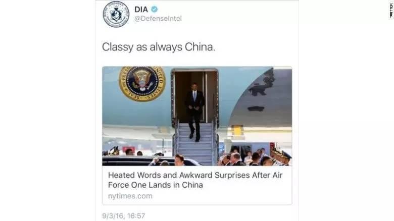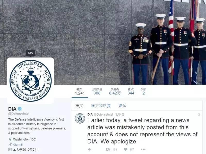 PS:那個發推特諷刺中國的美國國防情報局,后來很快刪帖了,還更新的推文道歉,稱之前的貼子是被錯誤地發出,不能代表國防情報局觀點。